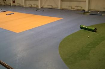 На сегодняшний день спортивные покрытия используют не только спортивные школы и секции, так же широкое применение это покрытие находит в частных тренажерных залах. Иногда заказчик желает получить не только удобное покрытие для занятий спортом, но и индивидуальных рисунок, составленный из нескольких цветов. Сложность при этом заключается только в том, что такое покрытие продается только целыми рулонами и, как правило, клиенты предпочитают комбинировать максимум три цвета. Стоимость укладки 150 р/м2.